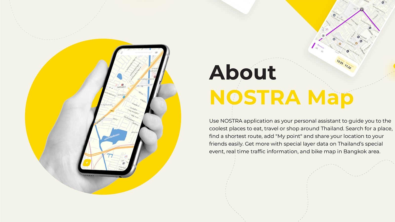 NOSTRA application as your personal assistant to guide you to the coolest places to eat, travel or shop around Thailand. Search for a place, find a shortest route, add “My point” and share your location to your friends easily. Get more with special layer data on Thailand’s special event, real time traffic information, and bike map in Bangkok area.