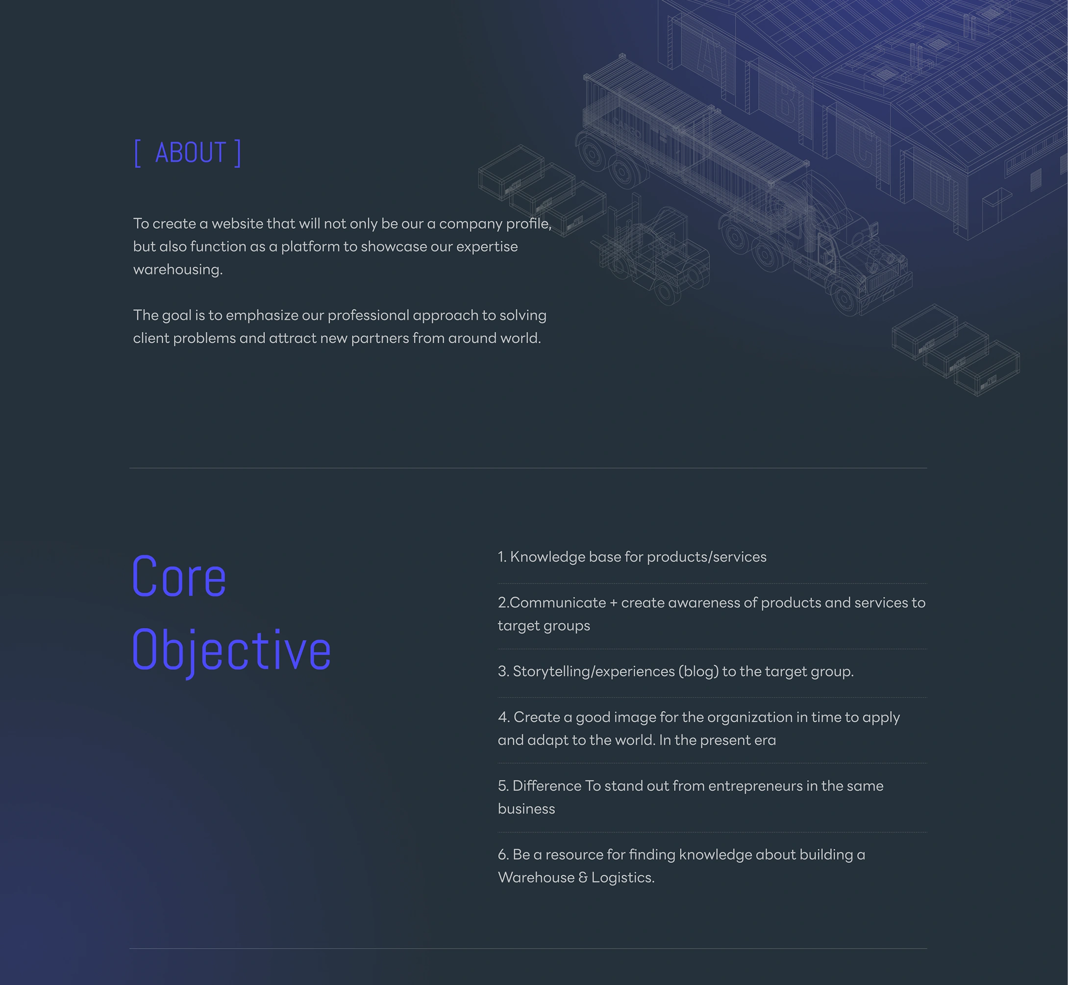 To create a website that will not only be our a company profile, but also function as a platform to showcase our expertise warehousing.